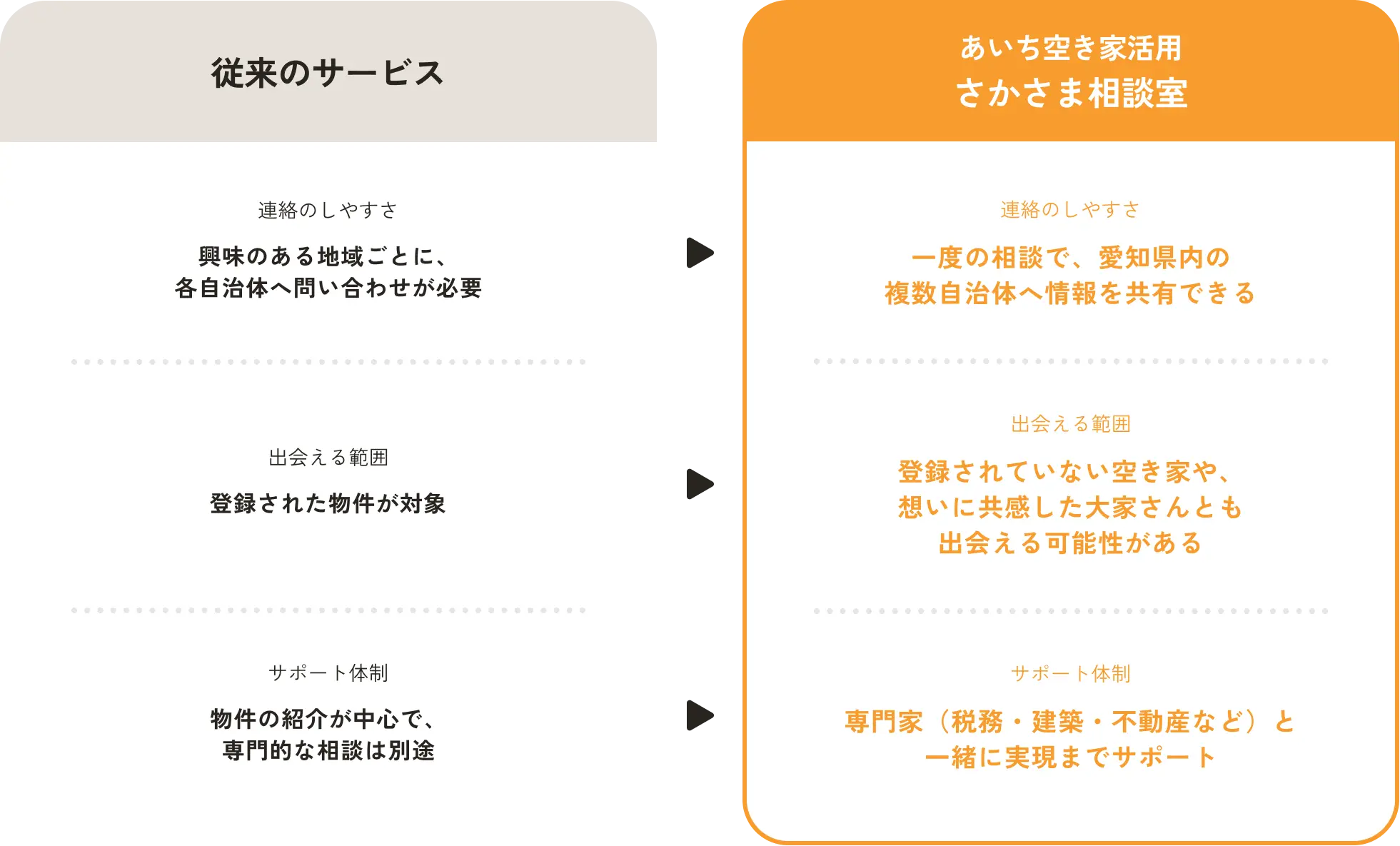 さかさま相談室は、 物件探しからではなく “あなたの想い”から 始める相談窓口。 想いを県内自治体や 専門家と共有し、 空き家を新しい始まりへと つなげます。